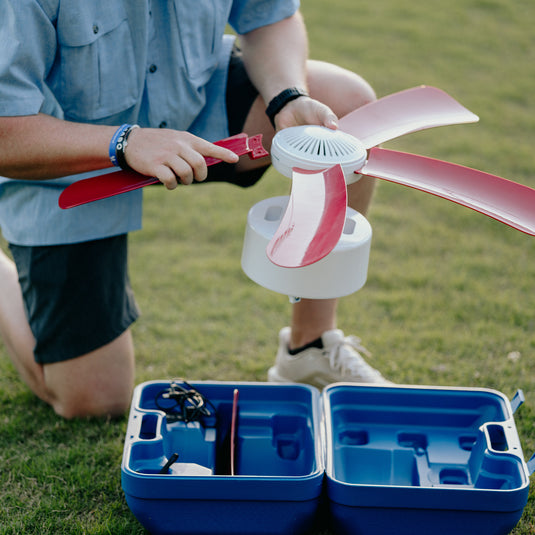 The Canopy Breeze kit contains a motor assembly, five fan blades, remote control, charger and down rod extension accessory, all in a durable, lightweight travel case.
