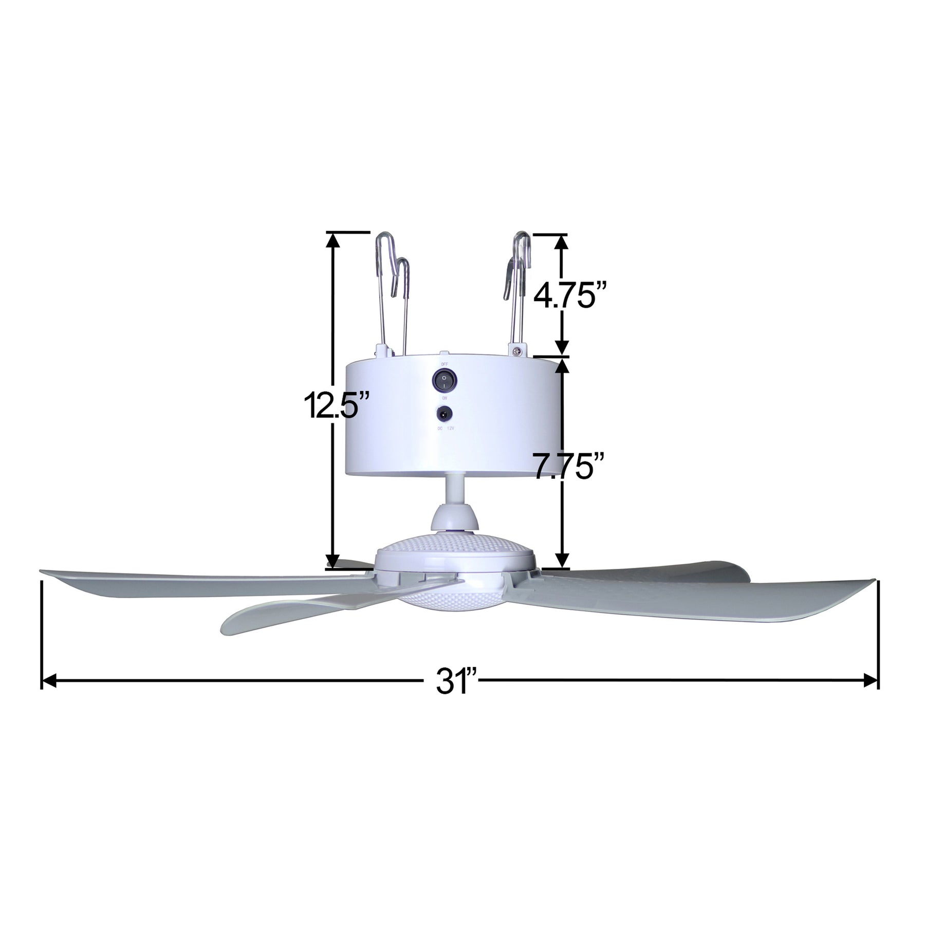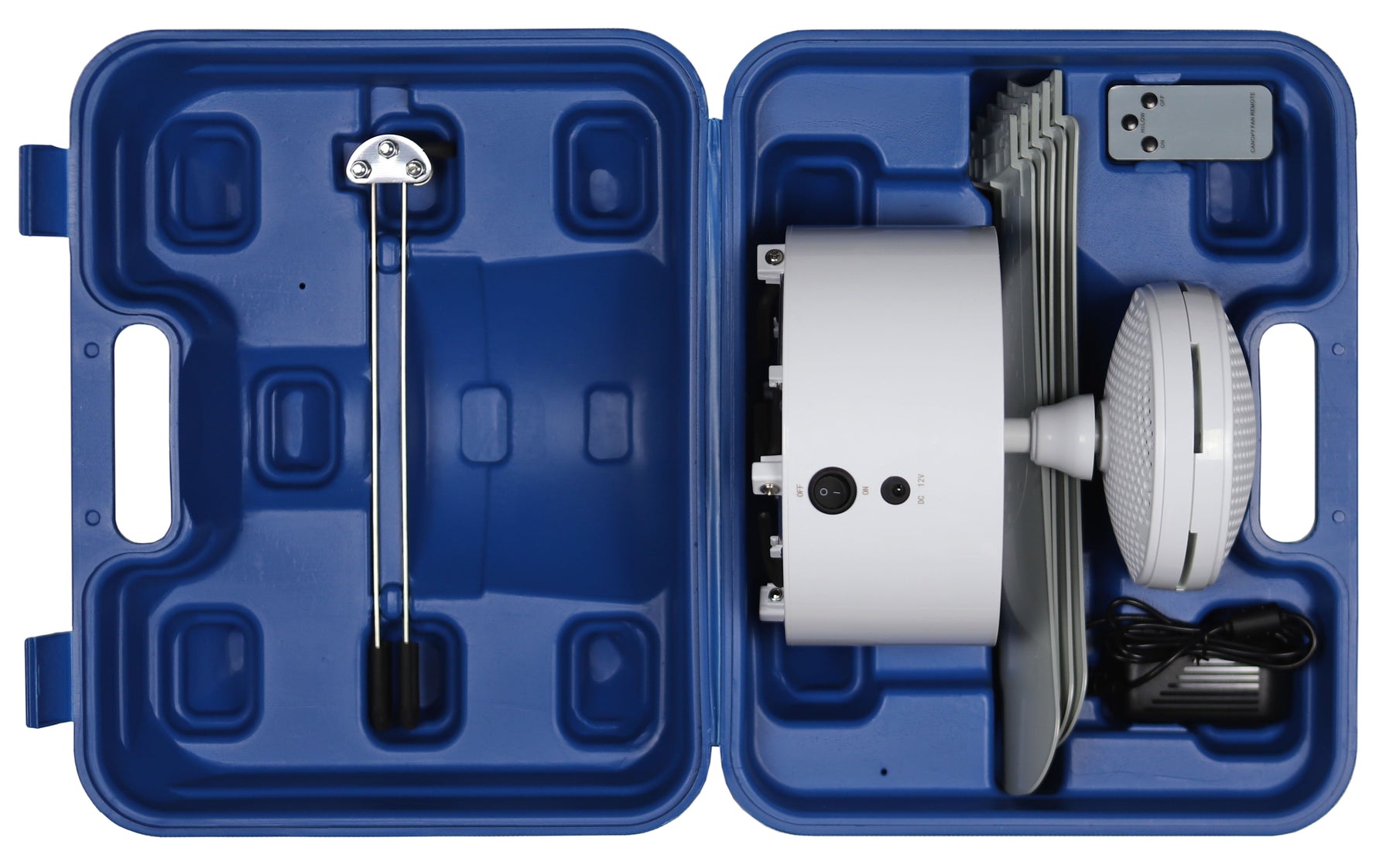Canopy Breeze® Canopy Fan is a rechargeable ceiling fan compatible with most 10' and 12' portable canopies. In addition to the hooks on top of the fan, Canopy Breeze also has a hoop in the center of the top, so it can be mounted on a hook. This is a great solution for pergolas, gazebos, dorm rooms, work shops and more! Now you can add a ceiling fan anywhere without the hassle of hardwiring or the need for an outlet. Our standard kit sells for $129.99 and comes with gray fan blades, or add your own unique style with fan blades in 11 different colors for $139.99.